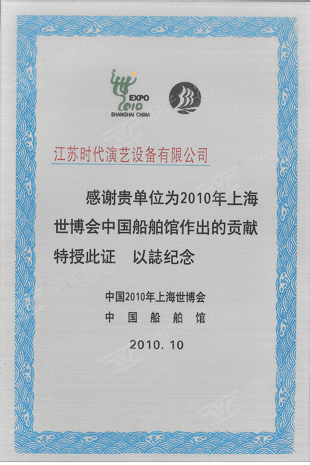 2010年上海世博會(huì)中國(guó)船舶館貢獻(xiàn)證書(shū)